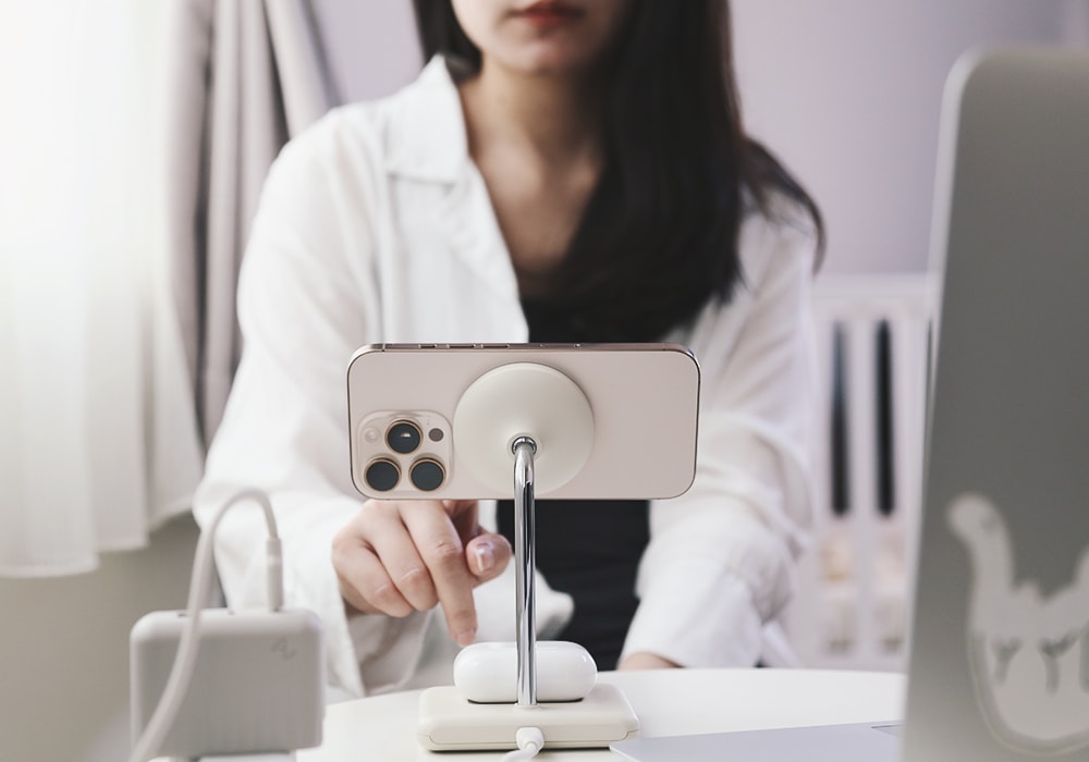 自從有了寶寶後,基本上雙手就沒解放過了,寶寶跟無尾熊一樣醒著就想抱抱,媽媽可以滑手機的時間變得很零碎,更別提想好好看一齣劇;不過後來發現把手機架在WQ1 2+1 磁吸無線充電座上,一放即吸,45度角剛剛好,就可以邊抱寶寶邊看劇,而且直式橫式還能任意切換,重點是根本不怕沒電(笑),簡直是媽媽福音!